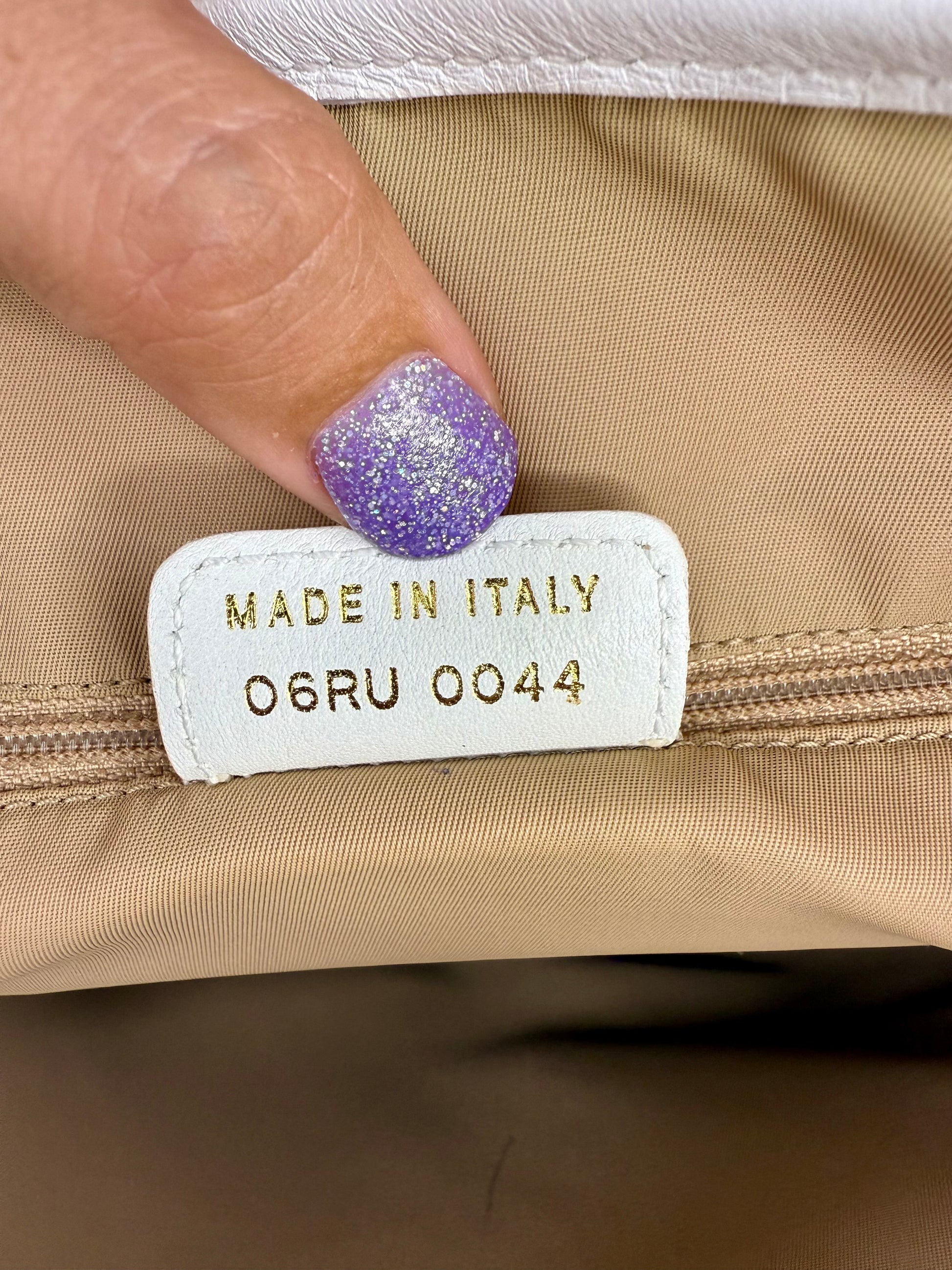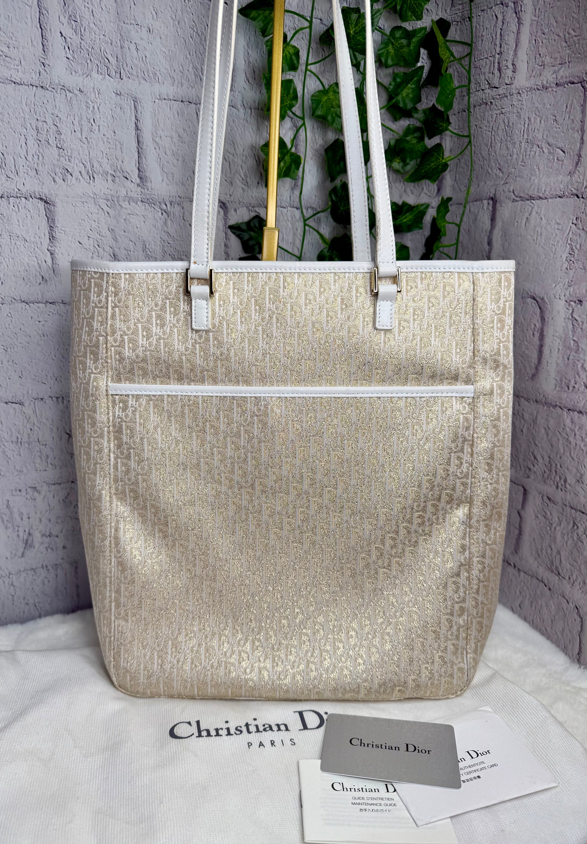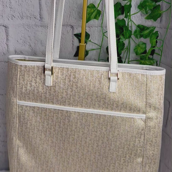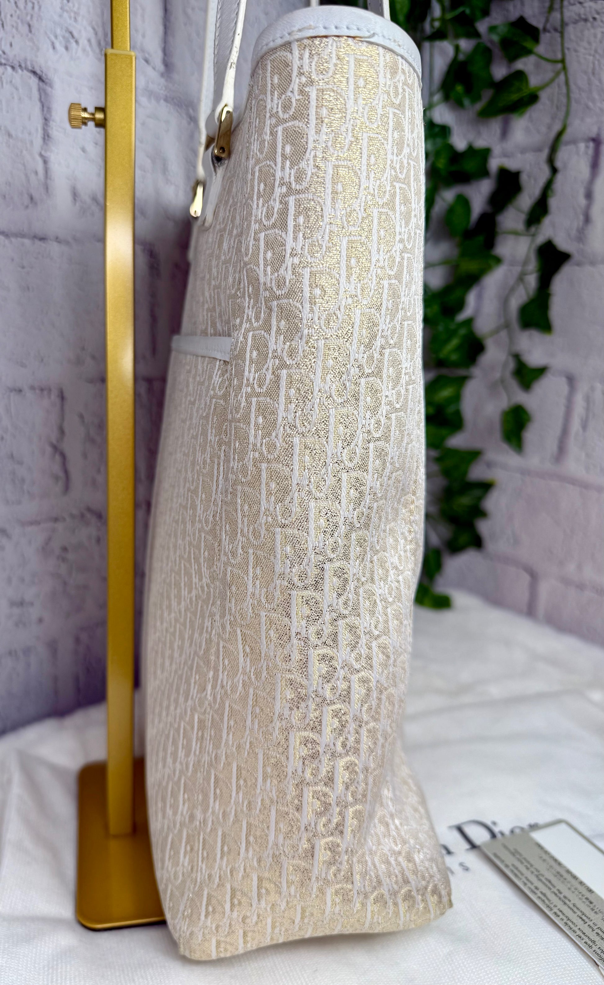 This exquisite tote bag is a versatile and chic choice for any occasion throughout the year. It boasts a stunning metallic gold/silver design featuring the iconic monogram in white, accentuated with white leather trim.