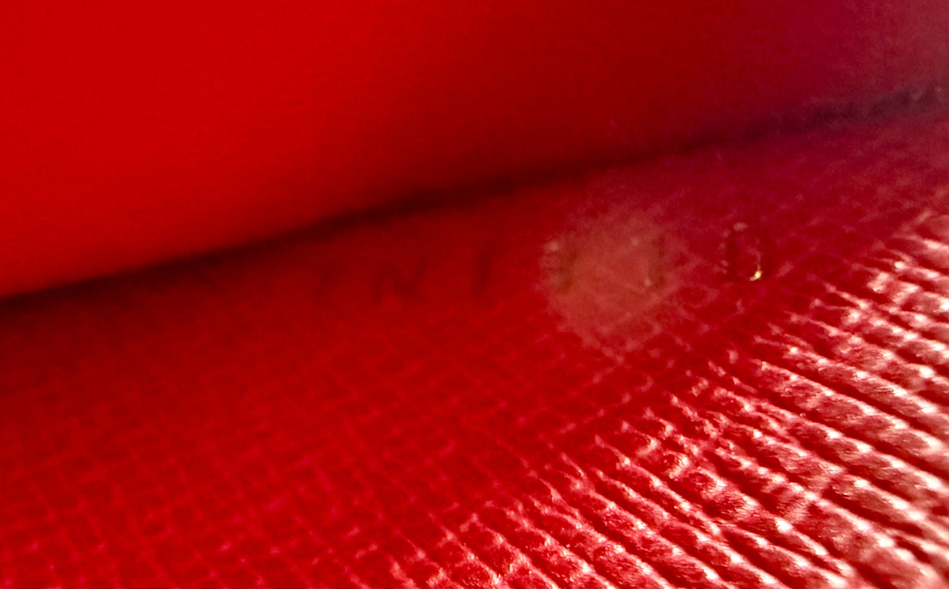 Interior: You'll be pleasantly surprised to find an additional flap in the interior, perfect for accommodating all those extra cards (10 credit card slots to be exact). As if that wasn't enough, this wallet also boasts a spacious bill compartment, a secret pocket, and a clear ID holder. And can we just take a moment to appreciate the vibrant red coated canvas lining? Trust us, it's nearly flawless with no major signs of wear or blemishes.