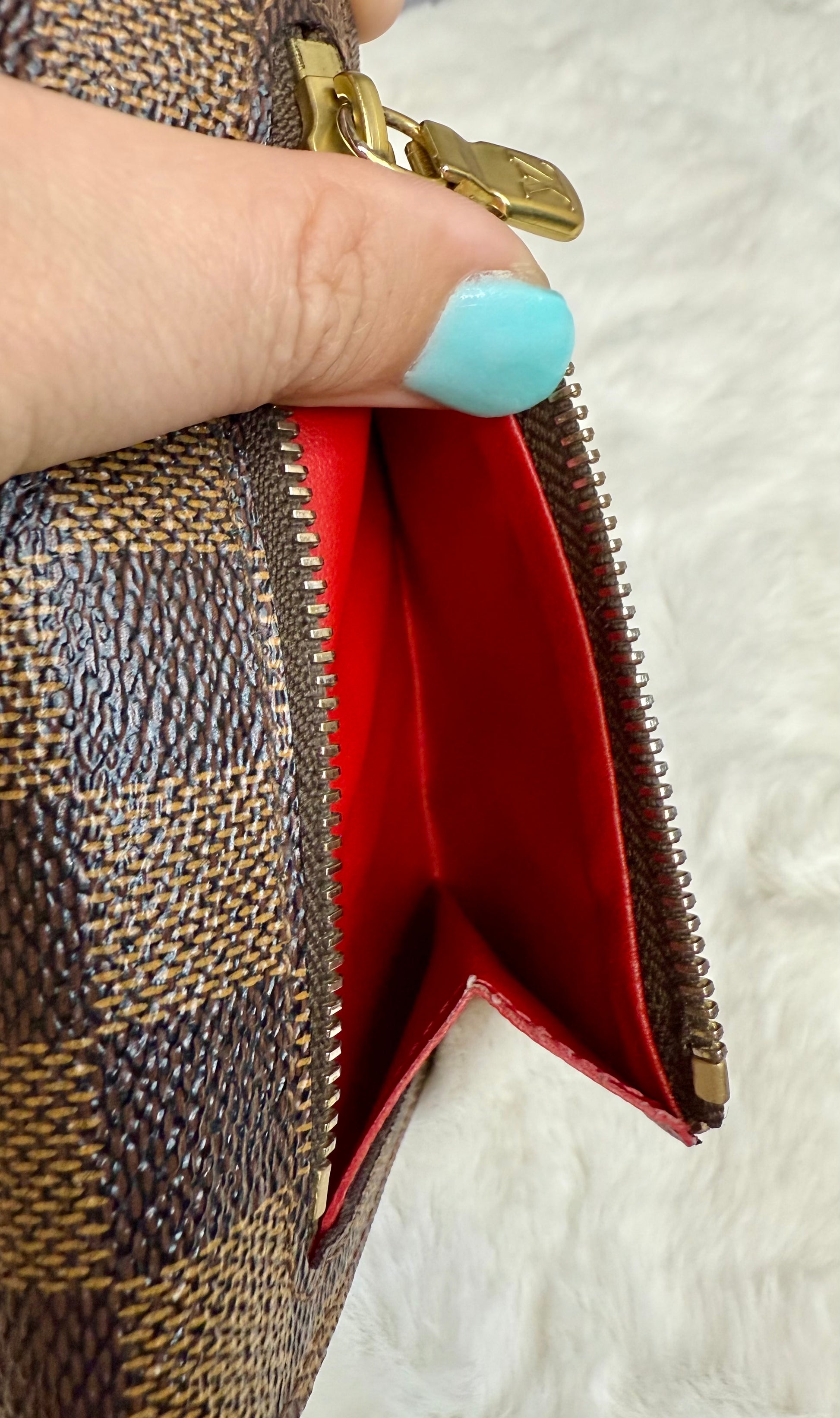 Exterior: This bifold wallet is crafted with Damier Ebene coated canvas and includes a gold toned push lock and back zip coin pocket. Despite minor wear on one corner, the canvas remains free of rips or marks, while the lock shows light tarnishing and hairline scratches, preventing it from receiving an excellent condition rating.