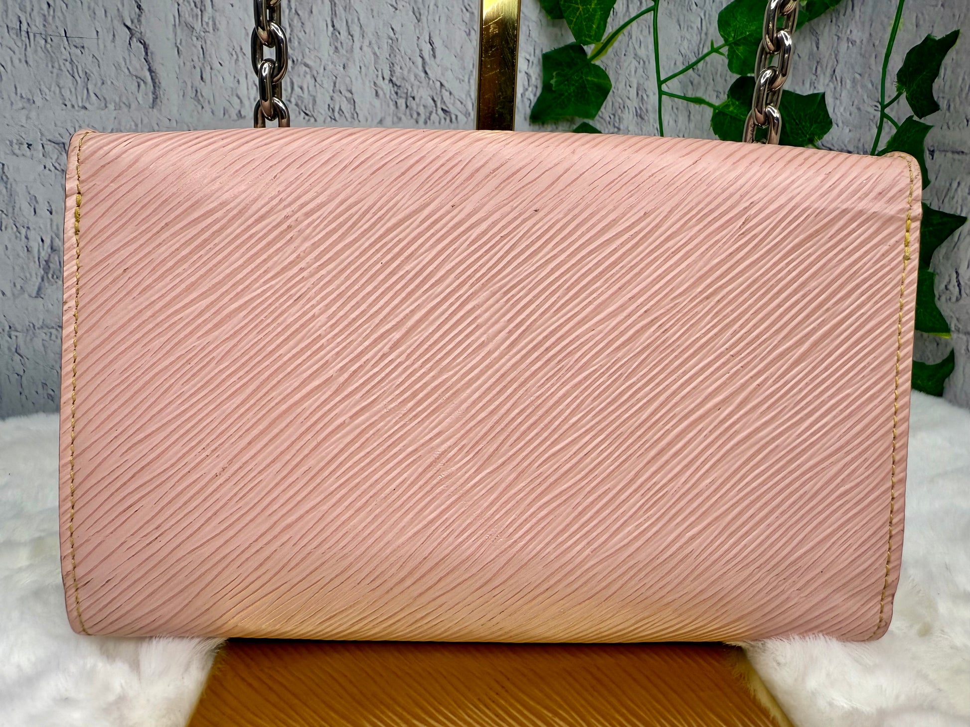 Exterior: Fantastic condition with only minimal signs of wear. The light pink epi leather has only a few scratches on the back, there is minor hairline scratches on the hardware, and some subtle dirt marks in a couple of spots. The attached chain and epi strap allow for versatile crossbody or shoulder carry. The stunning mechanical flowers are in excellent condition, adding a touch of whimsy.