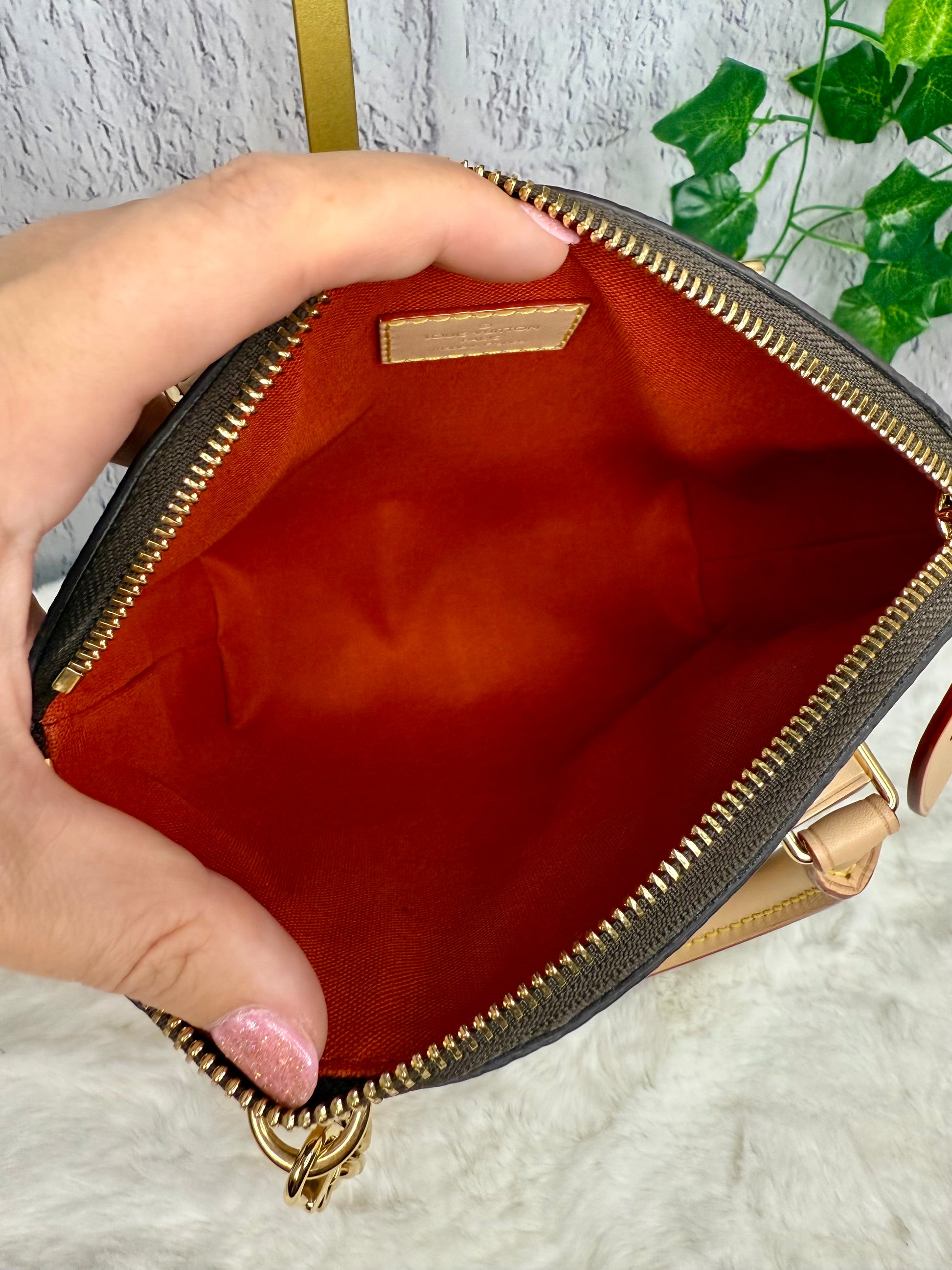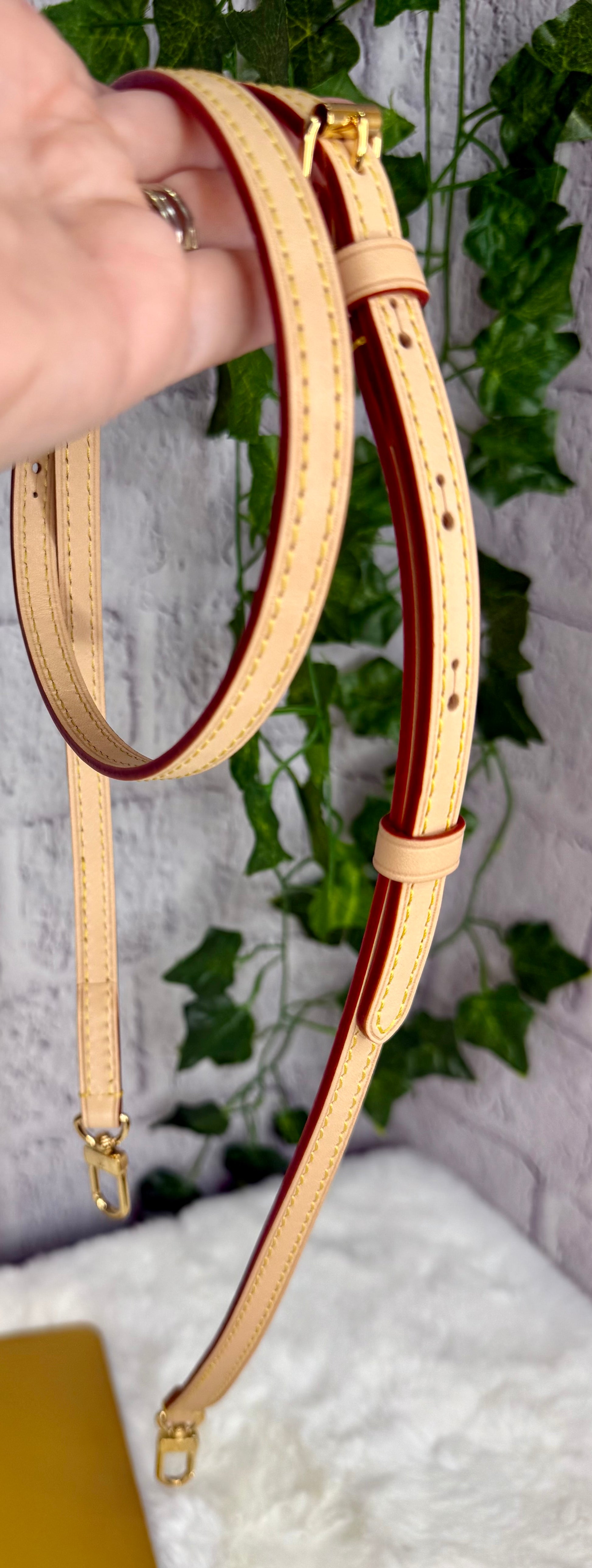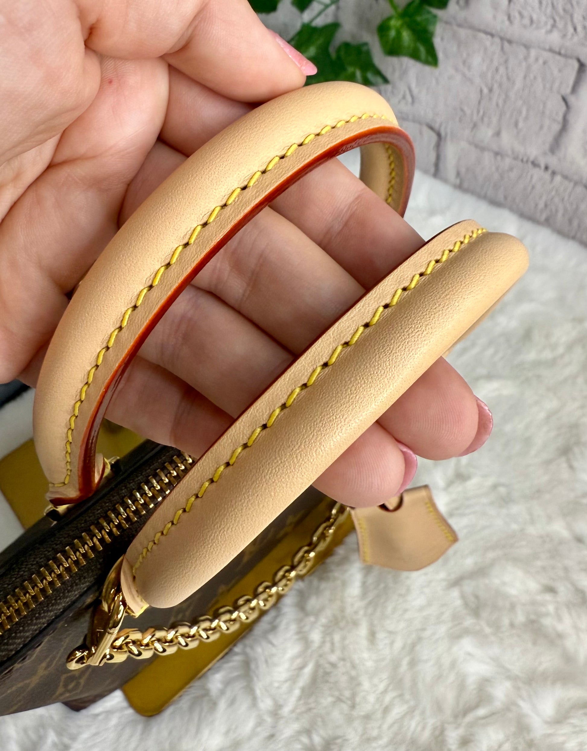 - Monogram coated canvas with beautiful, light vachetta leather trim and handles