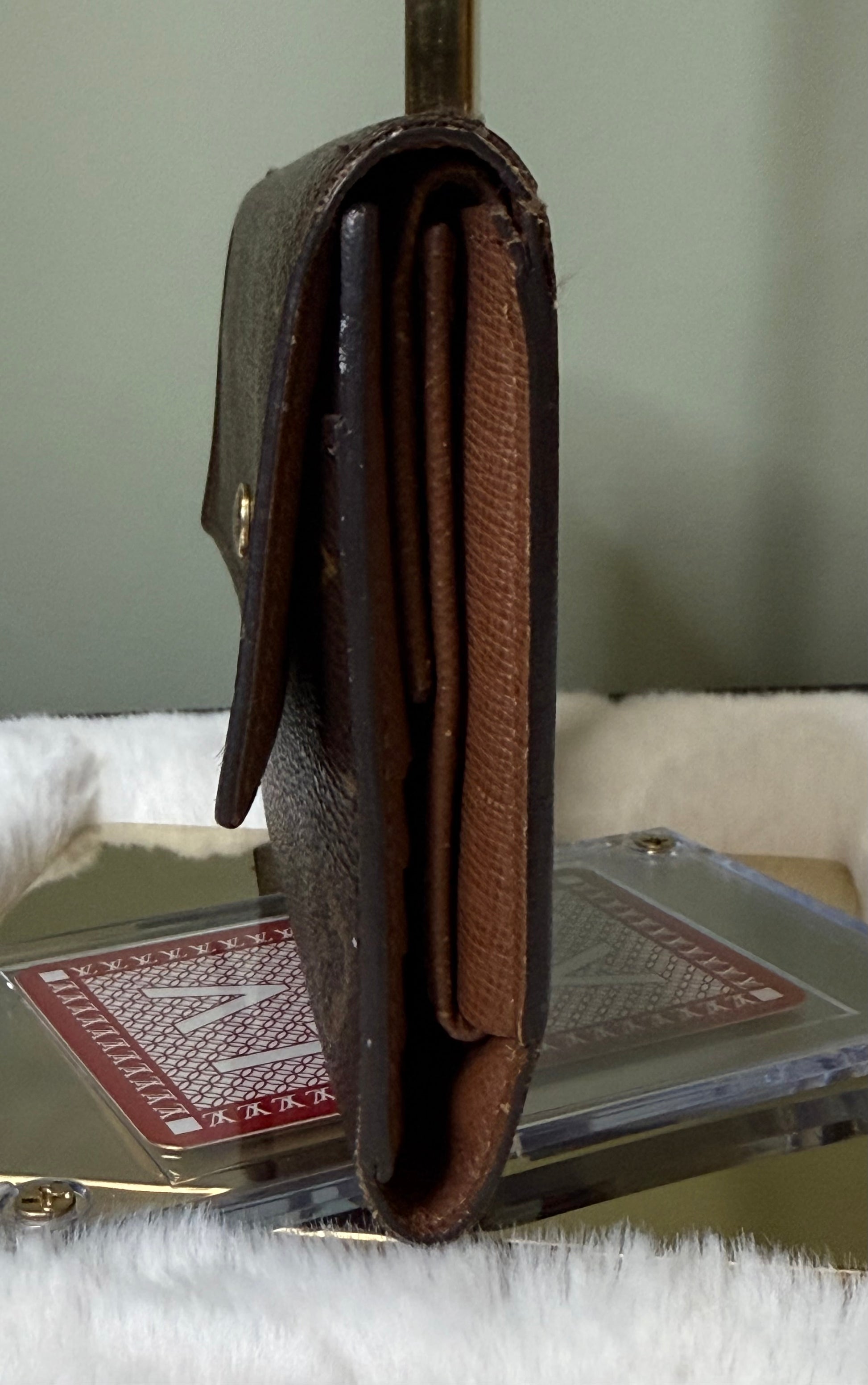 🤎 Interior: Overall clean with a couple dot marks and minor wear but the pockets do not have peeling, stickiness, or odors. It features 8 card slots, 2 “cash” compartments and a coin compartment (some coin dirt).