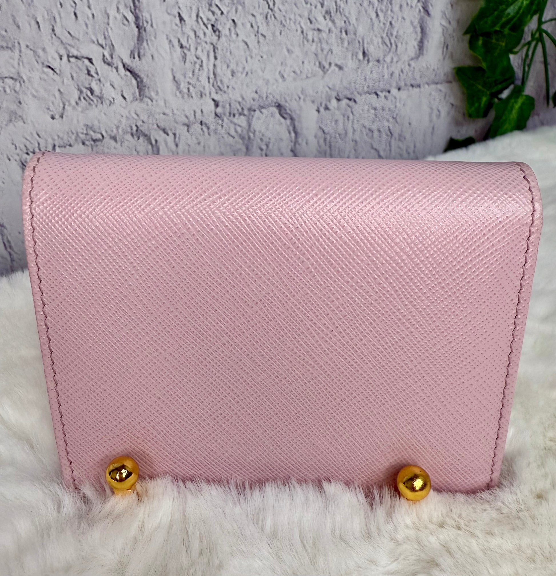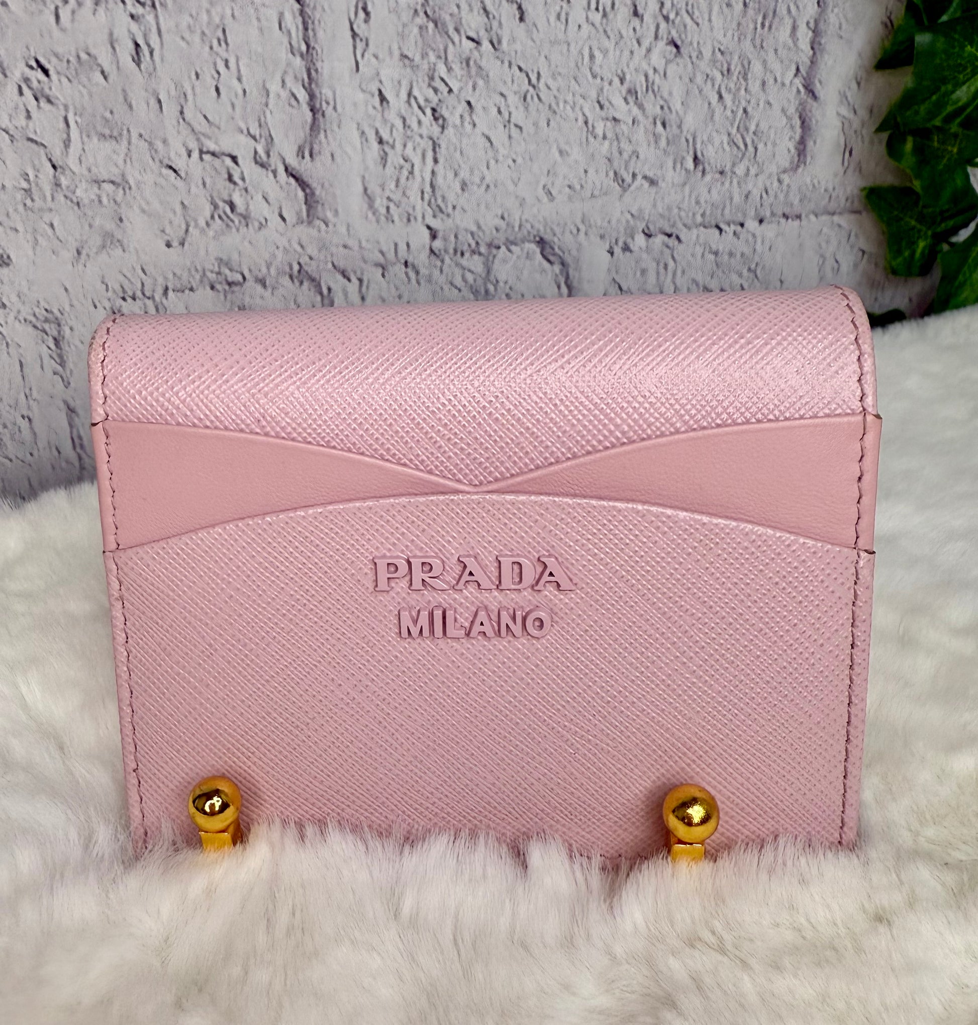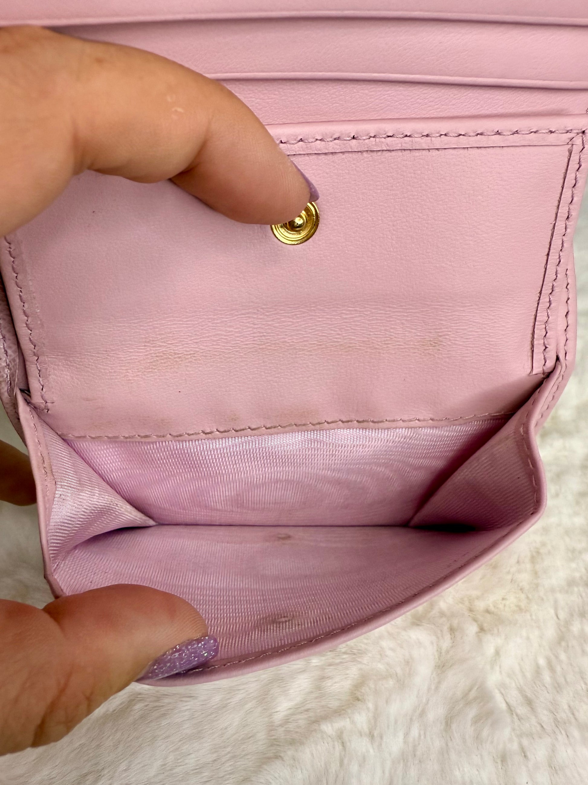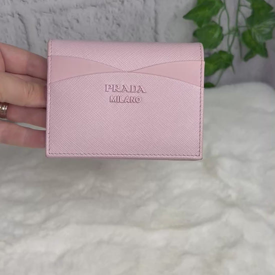 Prada Saffiano Leather Compact Wallet - Overall, it is in great condition with no major signs of wear. The only callouts would be a tiny spot on the top and some darkening/dirt marks on the interior of the coin pocket. It features a snap closure, two open slots on the front, 3 card slots, two open interior compartments, and a snap coin compartment.