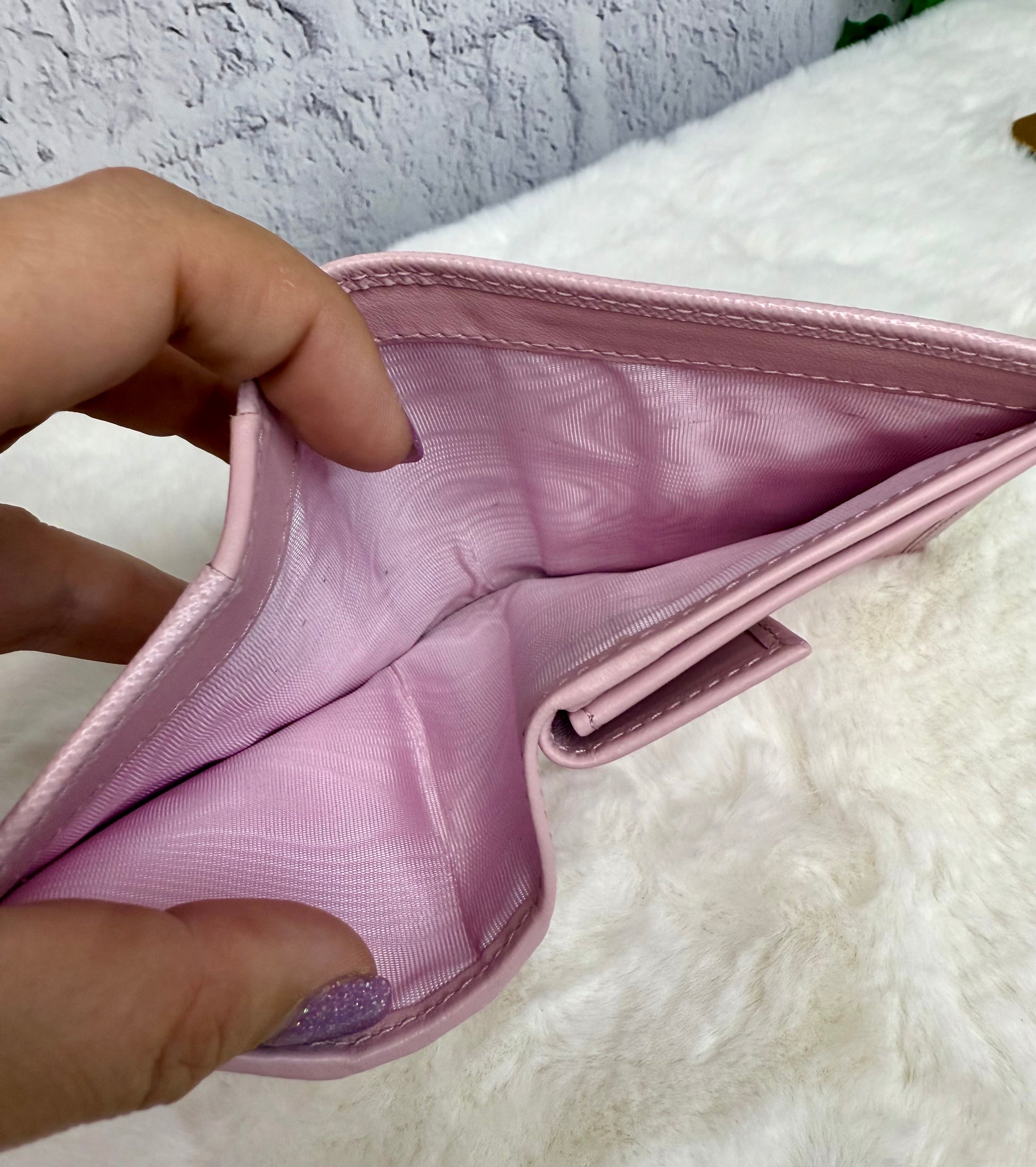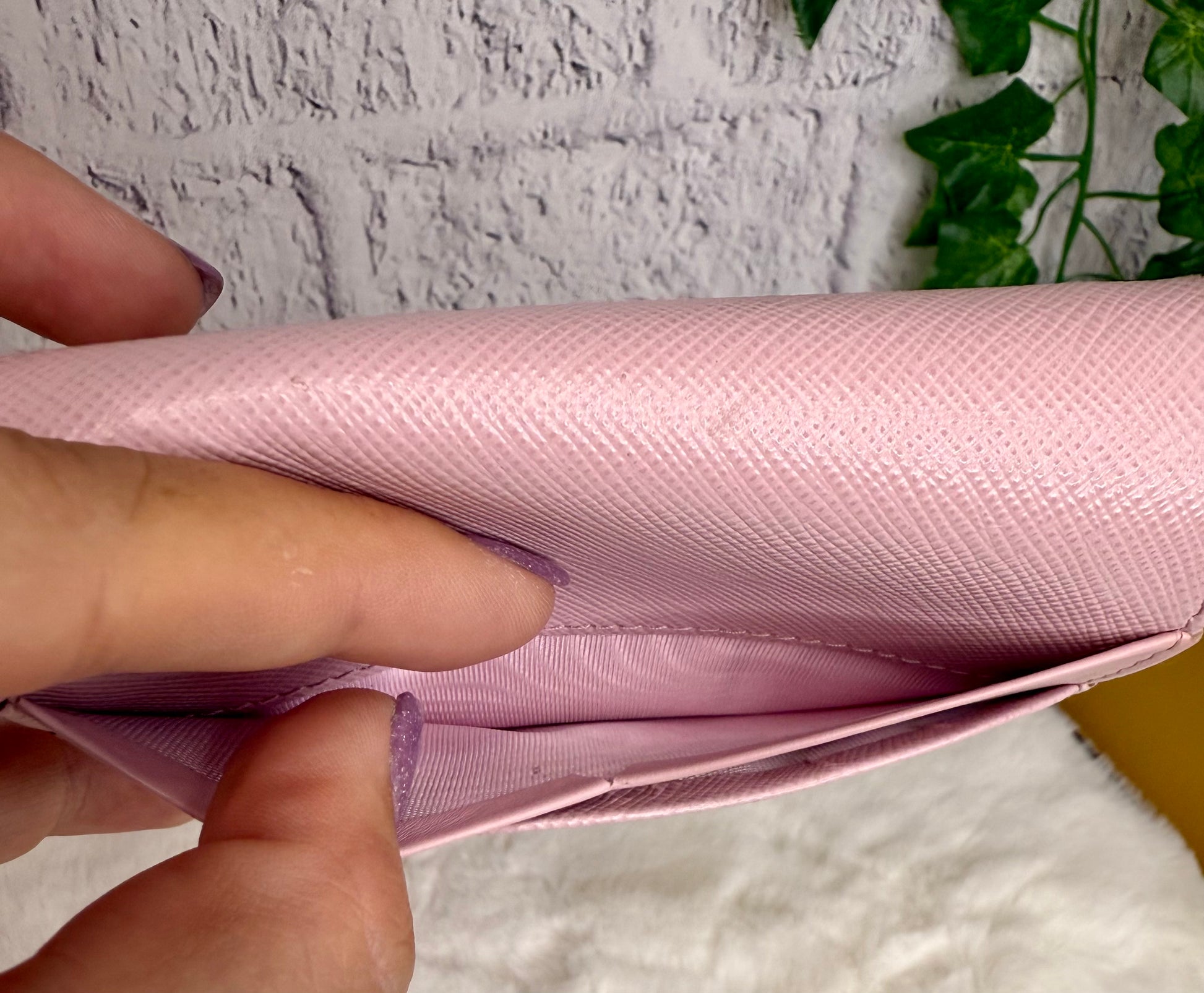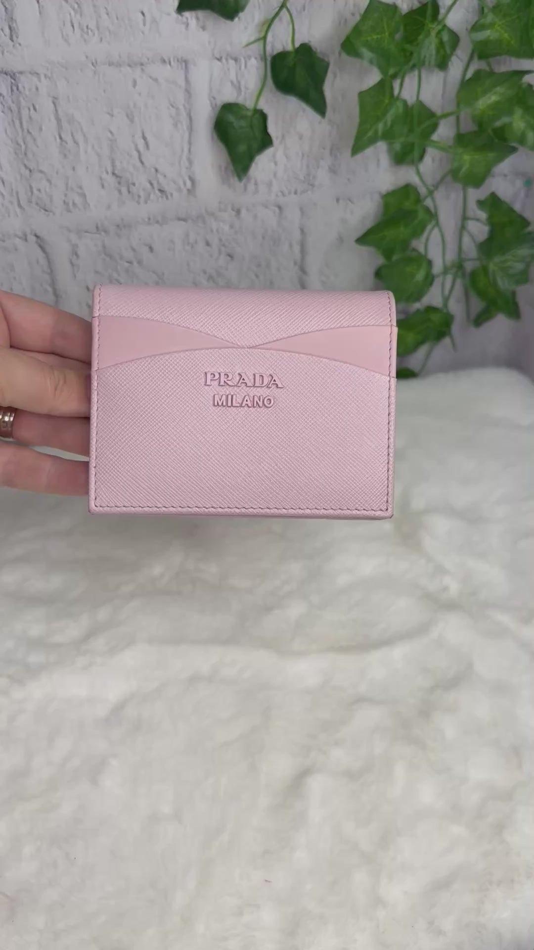 Prada Saffiano Leather Compact Wallet - Overall, it is in great condition with no major signs of wear. The only callouts would be a tiny spot on the top and some darkening/dirt marks on the interior of the coin pocket. It features a snap closure, two open slots on the front, 3 card slots, two open interior compartments, and a snap coin compartment.