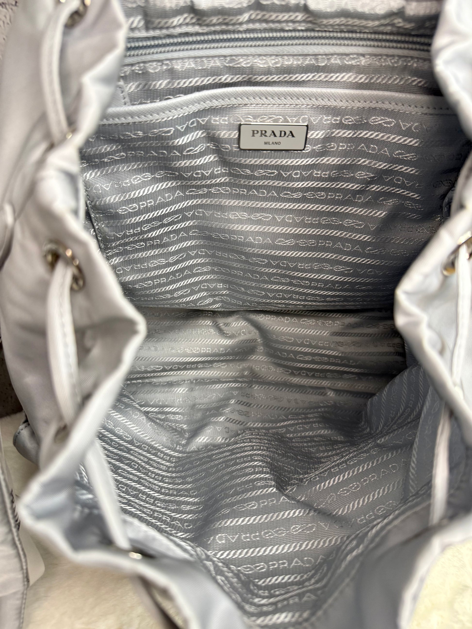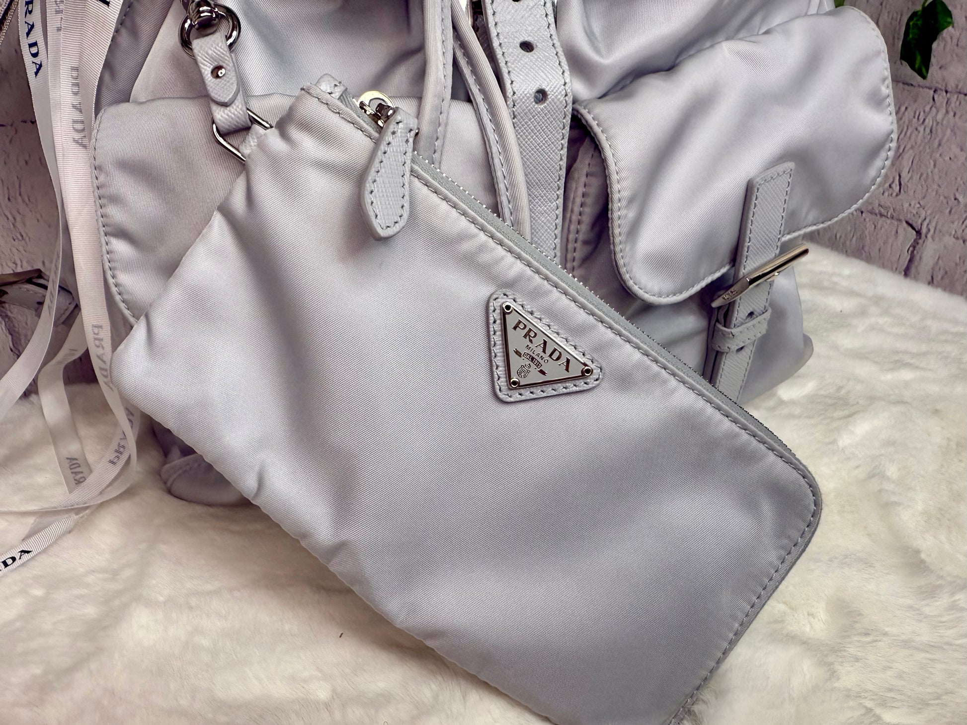 Prada Re Nylon Backpack - Absolutely STUNNING 🤩 Excellent condition with very minor signs of wear. There are no rips or foul odors - the exterior has a few tiny spots (see photos) - the interior is very clean with no imperfections! The bag features two clean front pockets, adjustable straps, drawstring and flap closure, attached zip pouch, an interior magnetic pocket, and interior zip pocket.