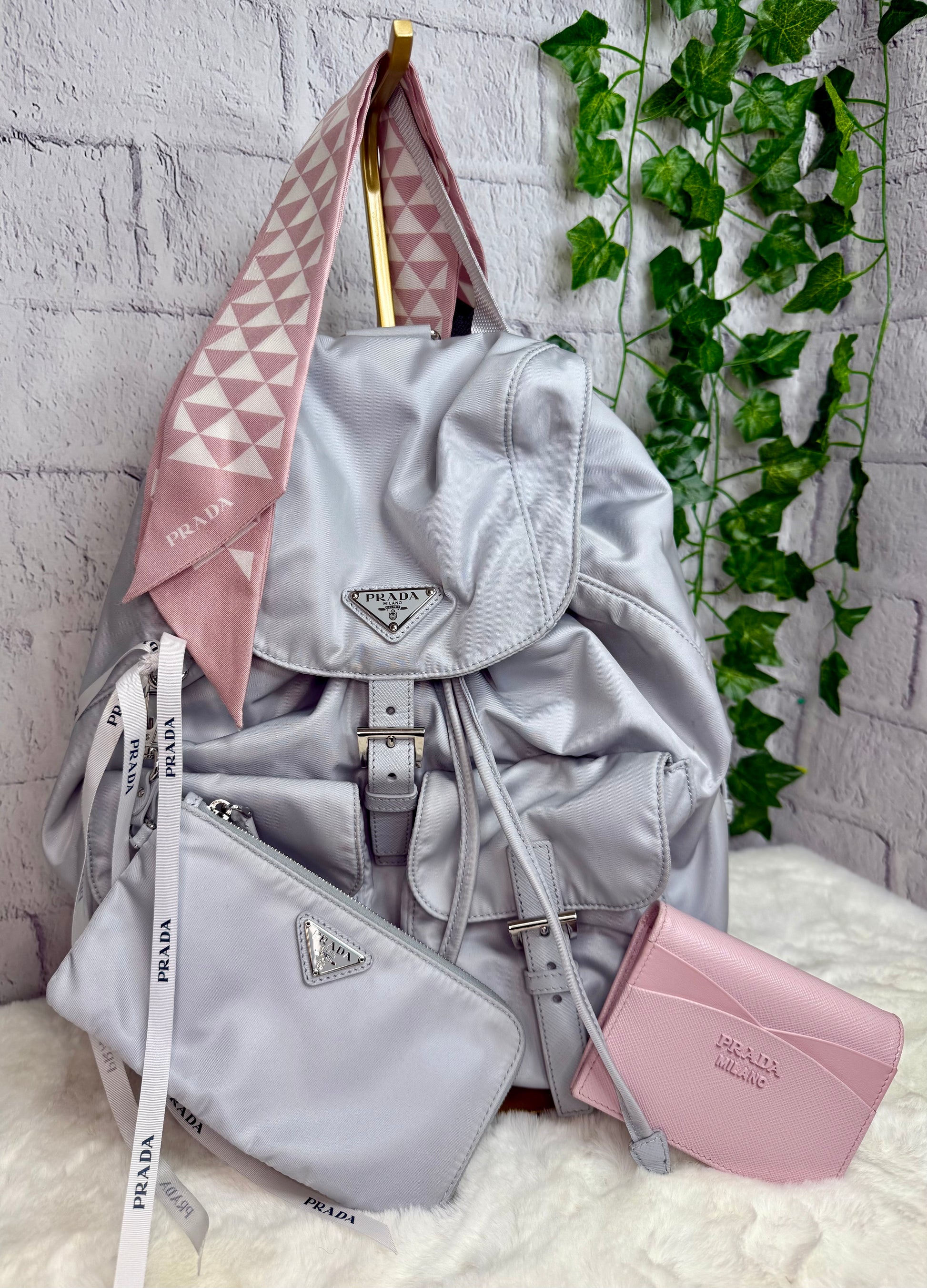 Prada Re Nylon Vela Backpack and Pouch (NEW VERSION - $2,400 Retail) w/ Pink Saffiano Leather Compact Wallet and Triangles Bandeau