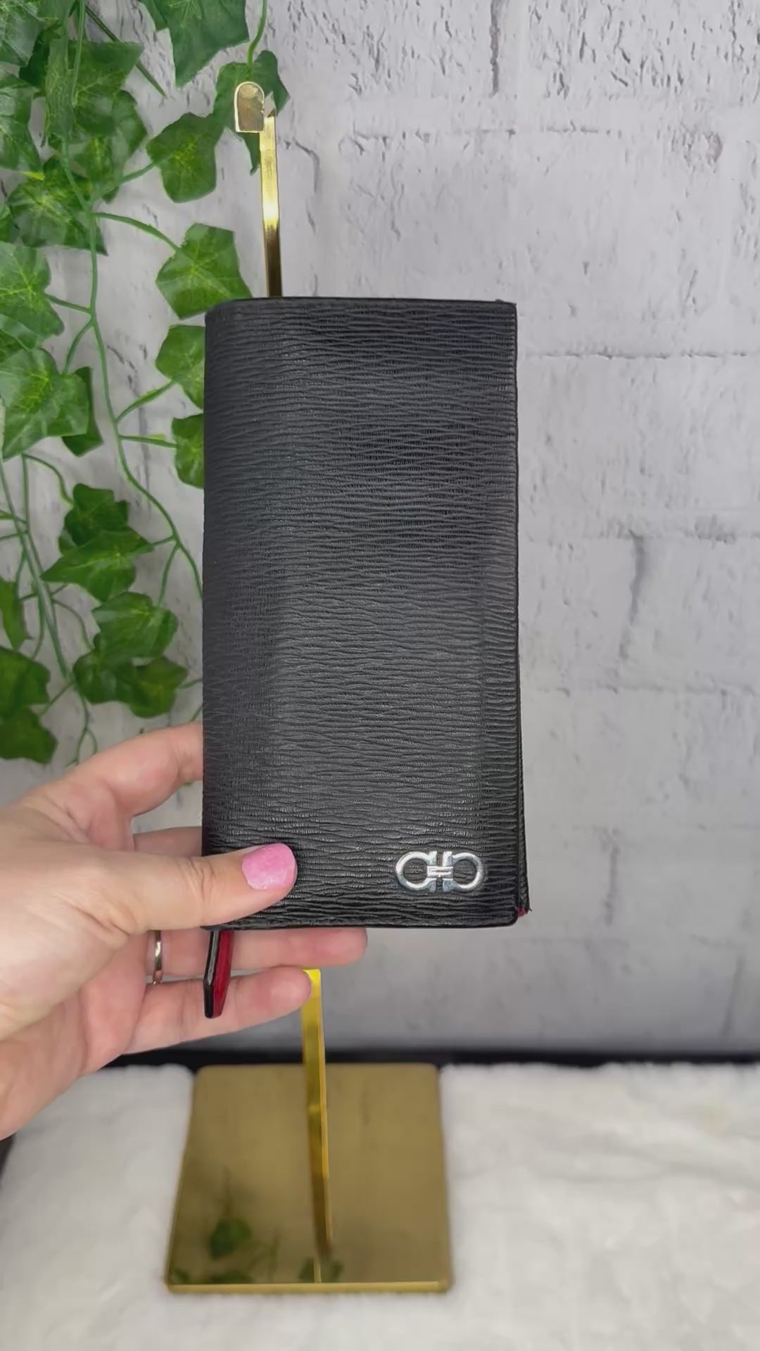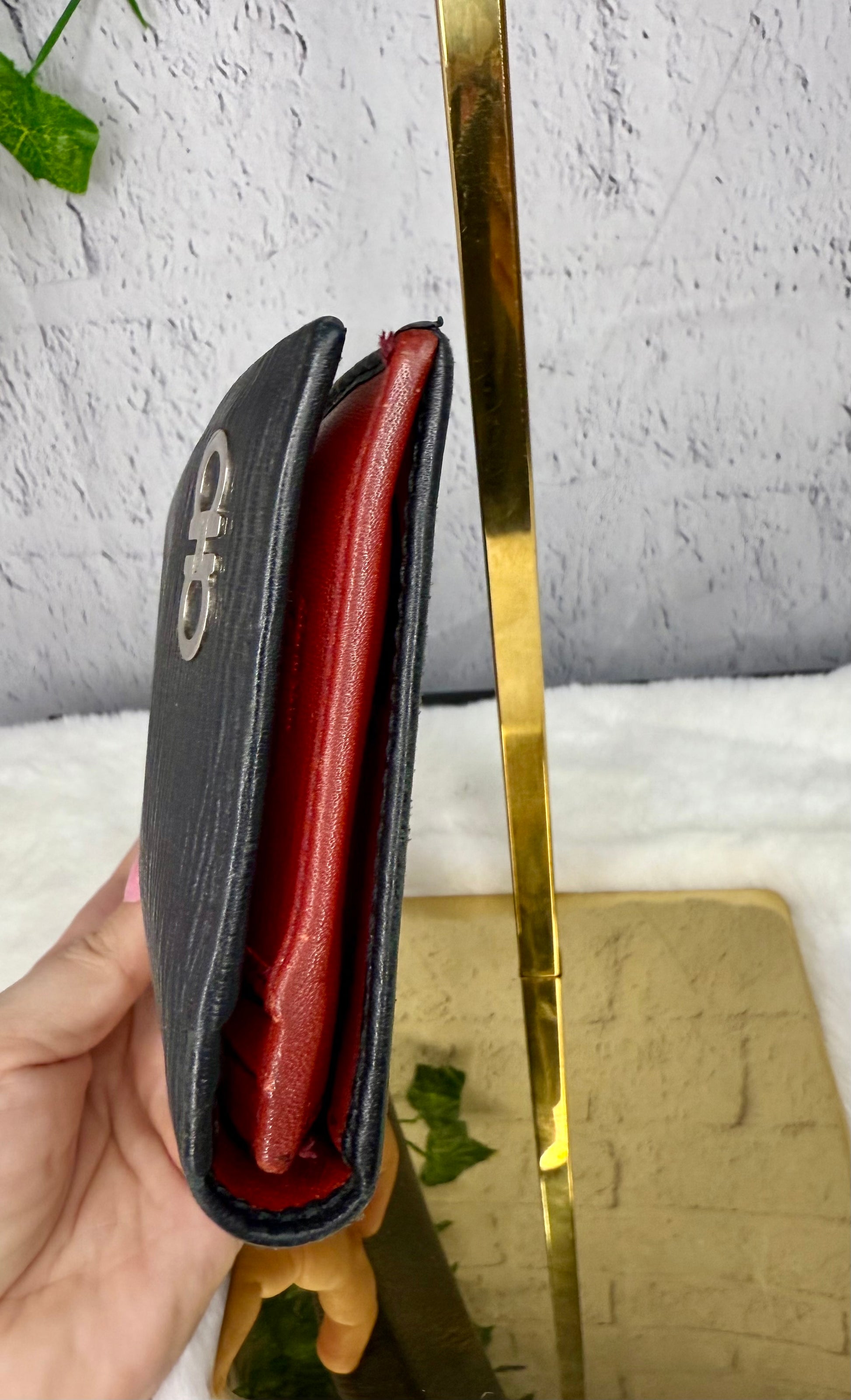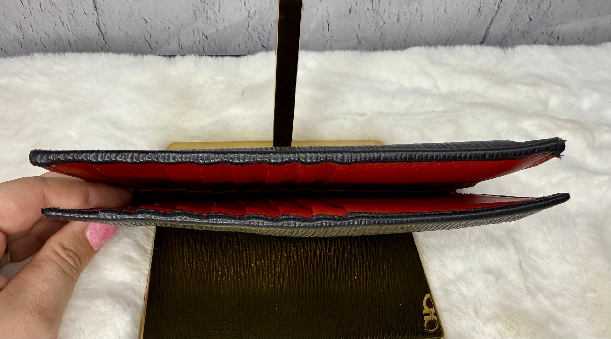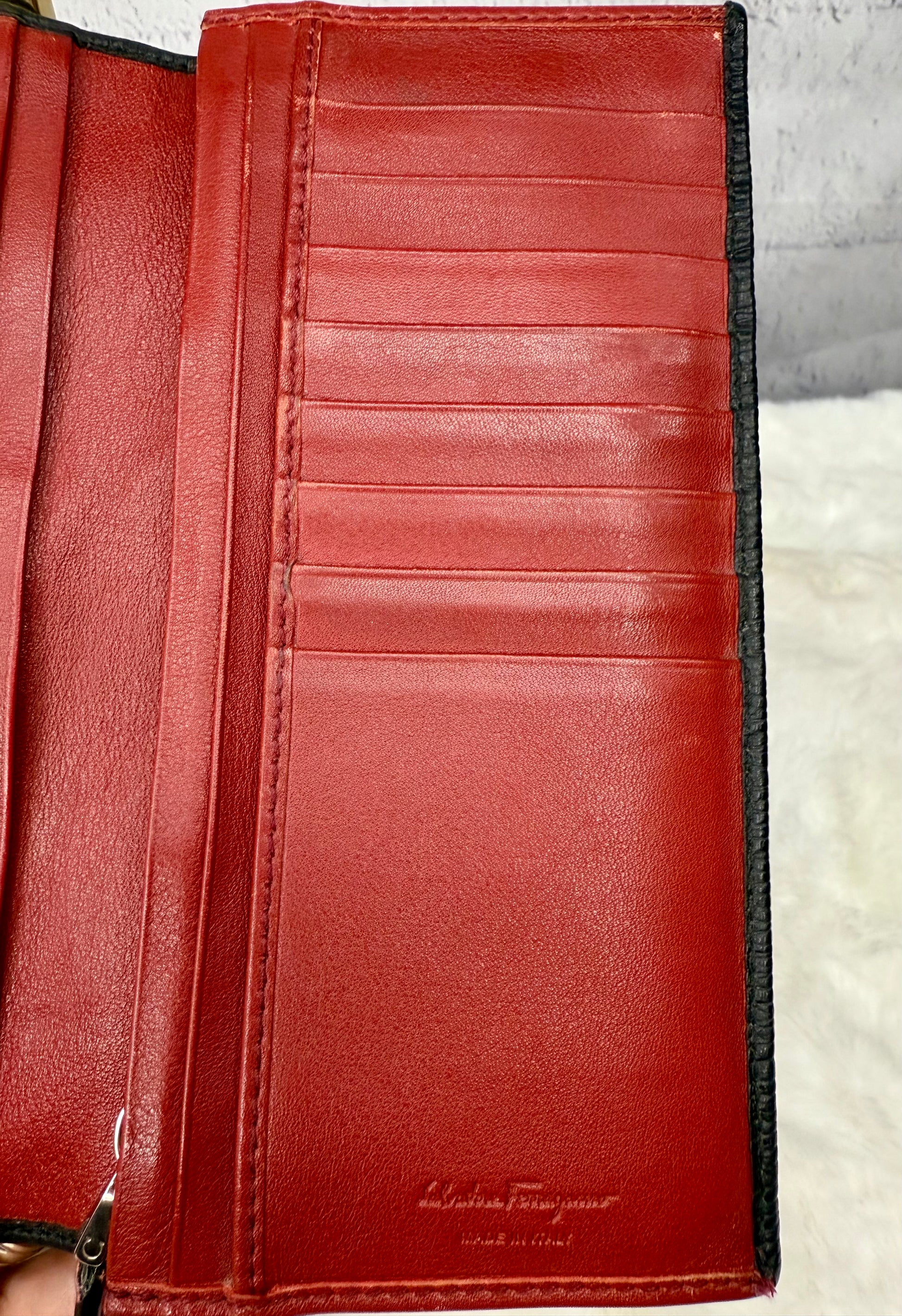 This authentic Salvatore Ferragamo Gancini Organizer Wallet is the perfect blend of fashion and practicality. The textured leather exterior adds a touch of sophistication while the bold red interior makes a statement. Keep your essentials organized in style!