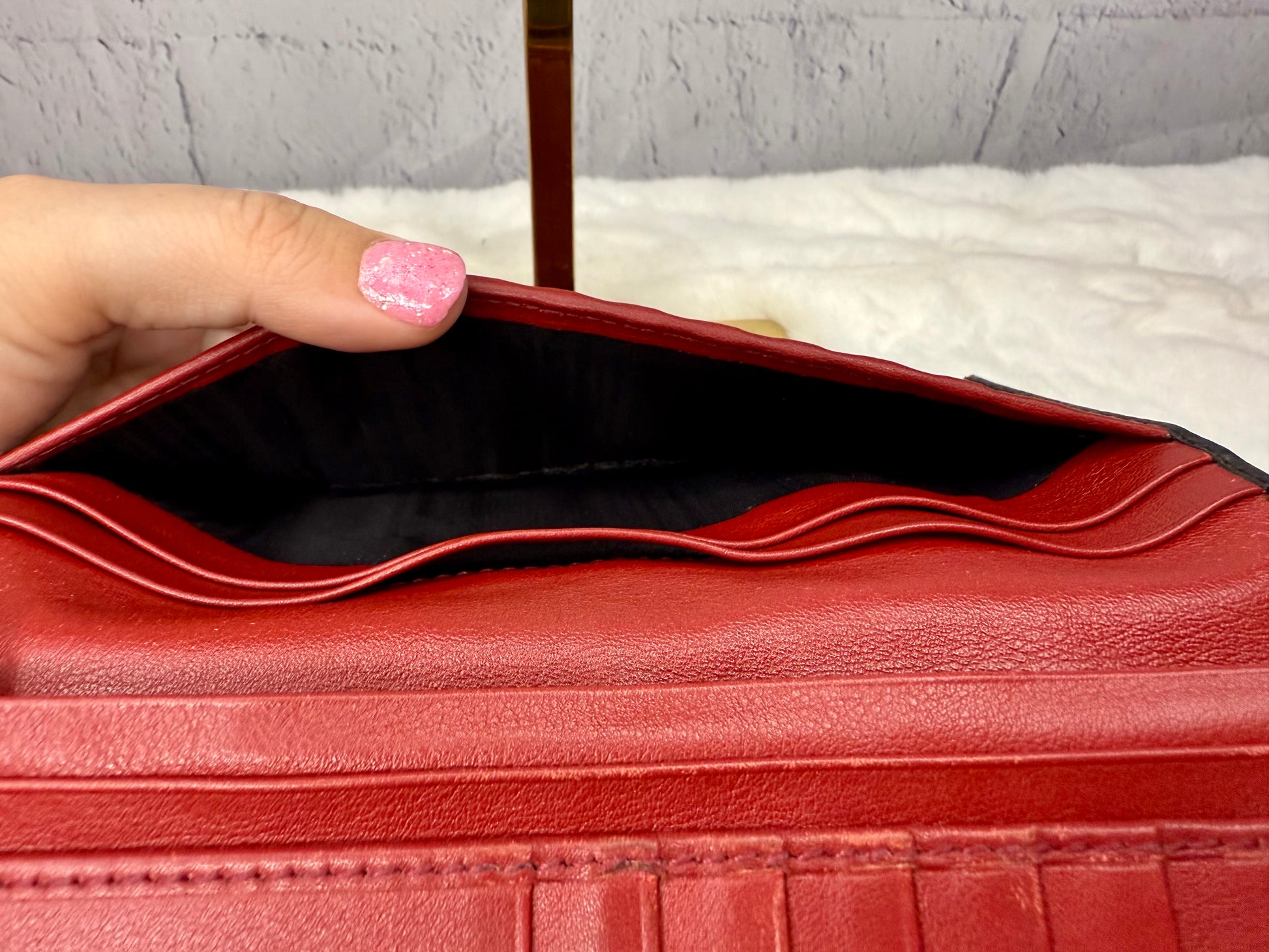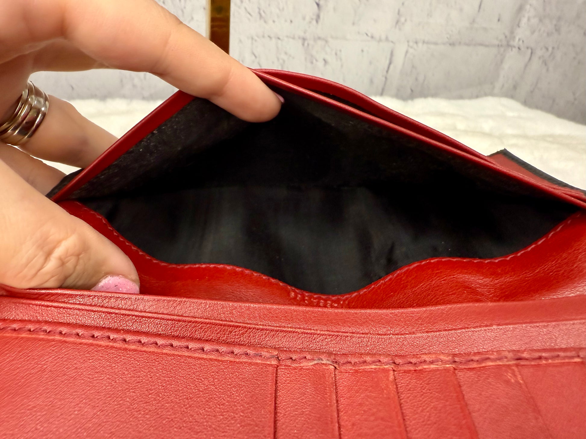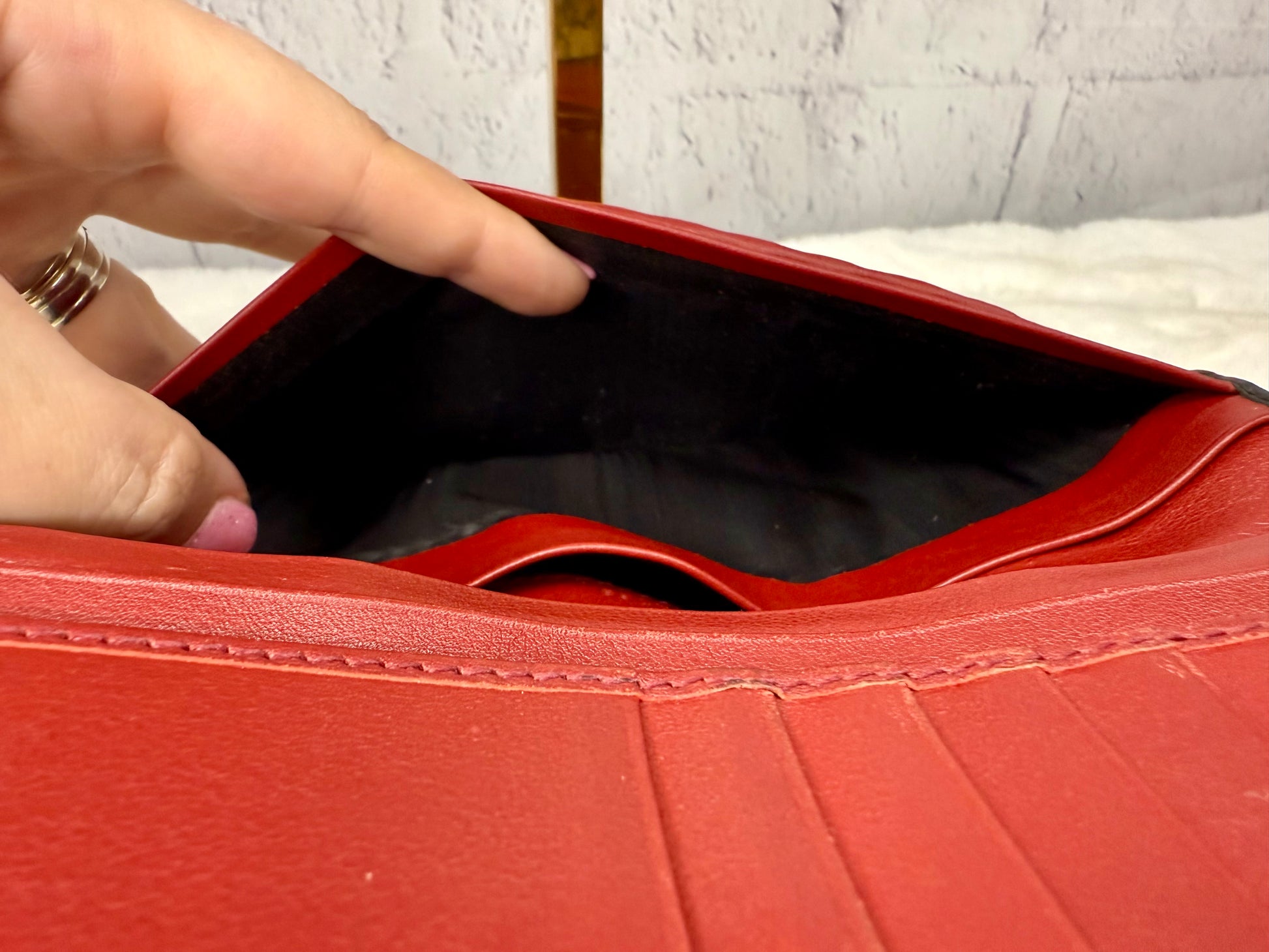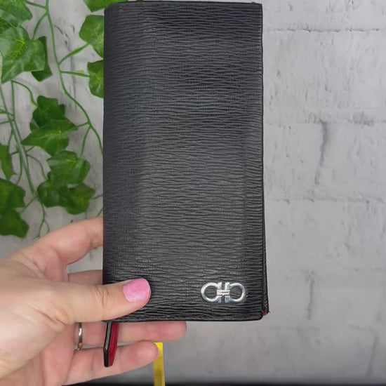 This authentic Salvatore Ferragamo Gancini Organizer Wallet is the perfect blend of fashion and practicality. The textured leather exterior adds a touch of sophistication while the bold red interior makes a statement. Keep your essentials organized in style!