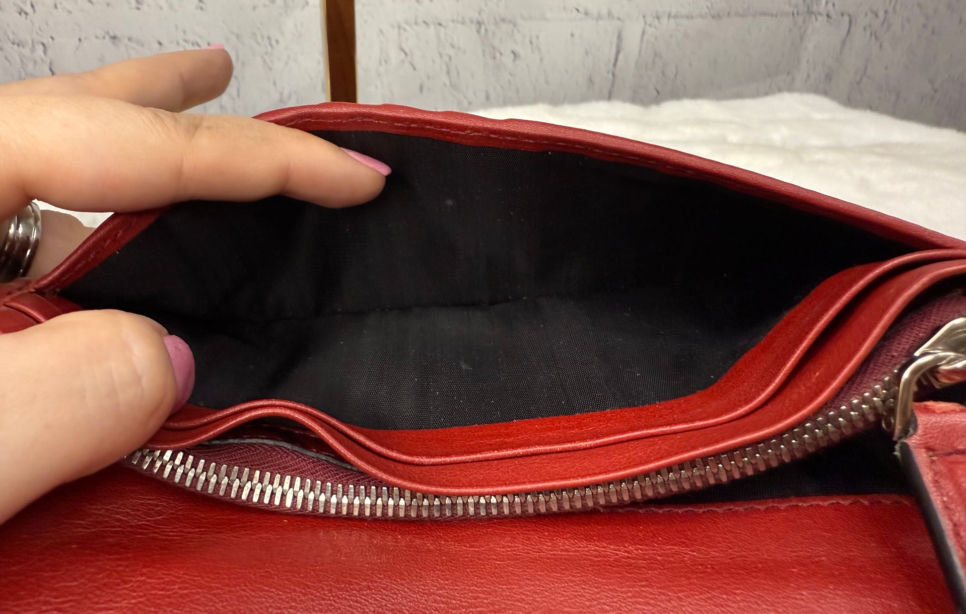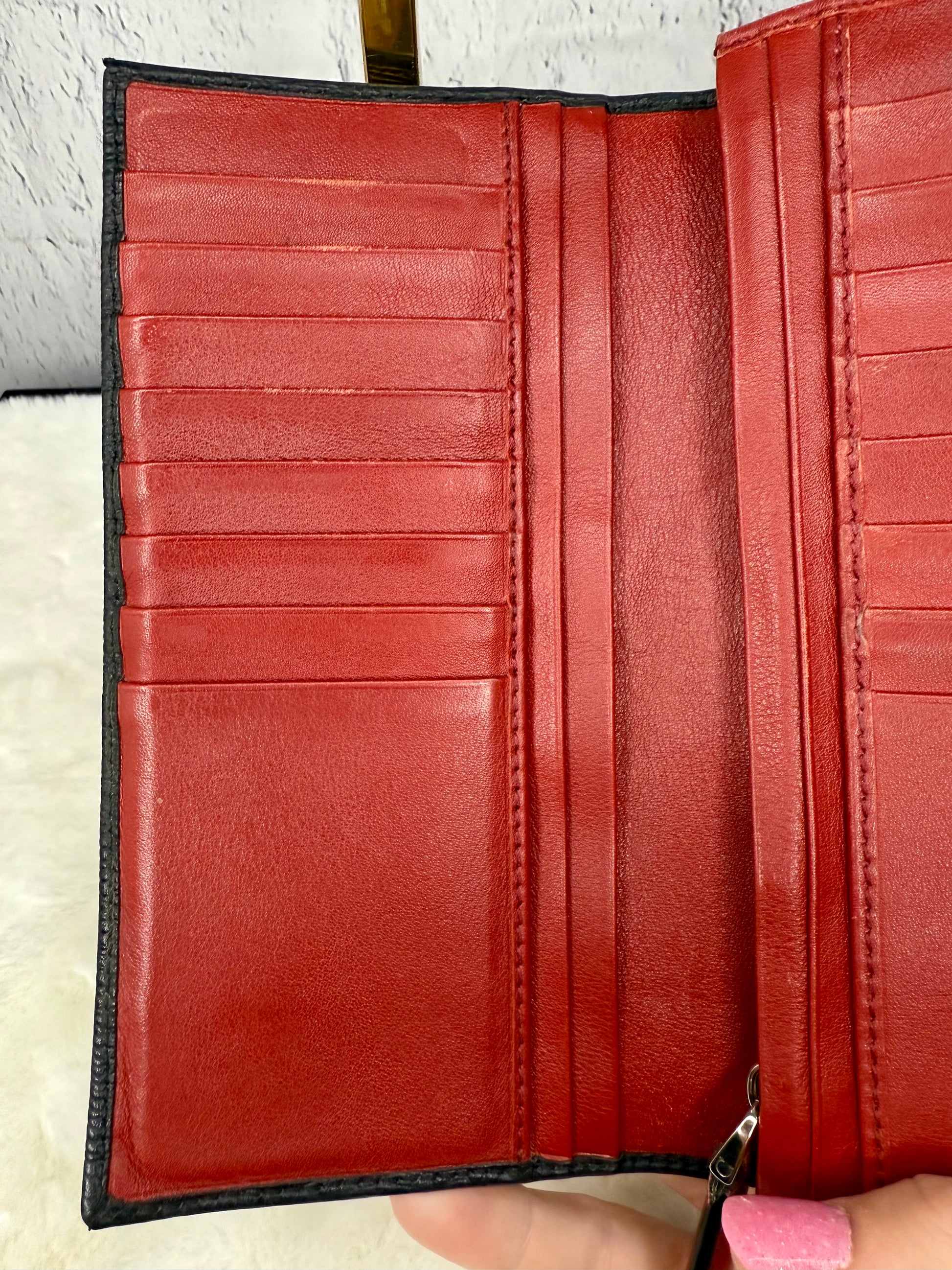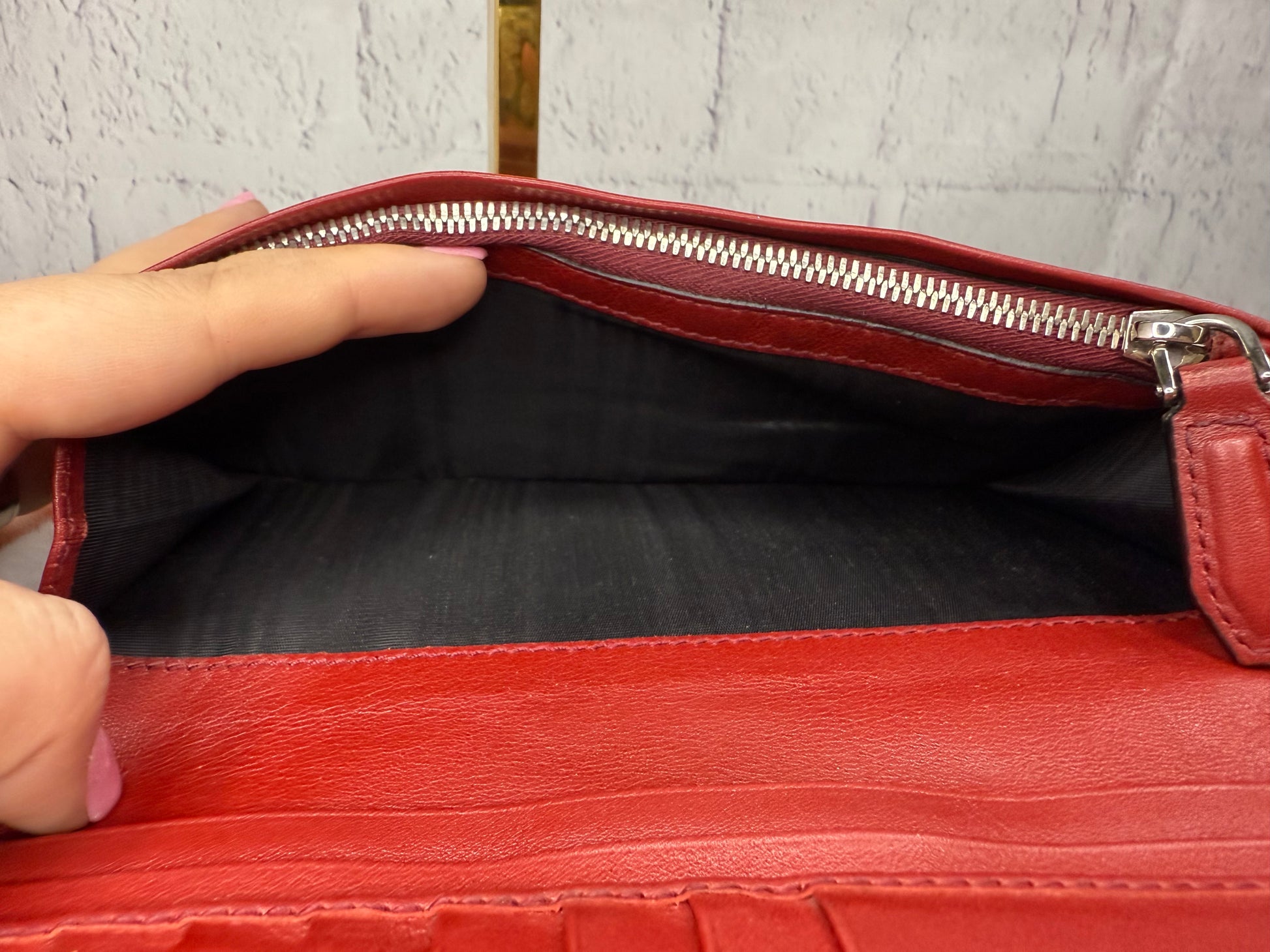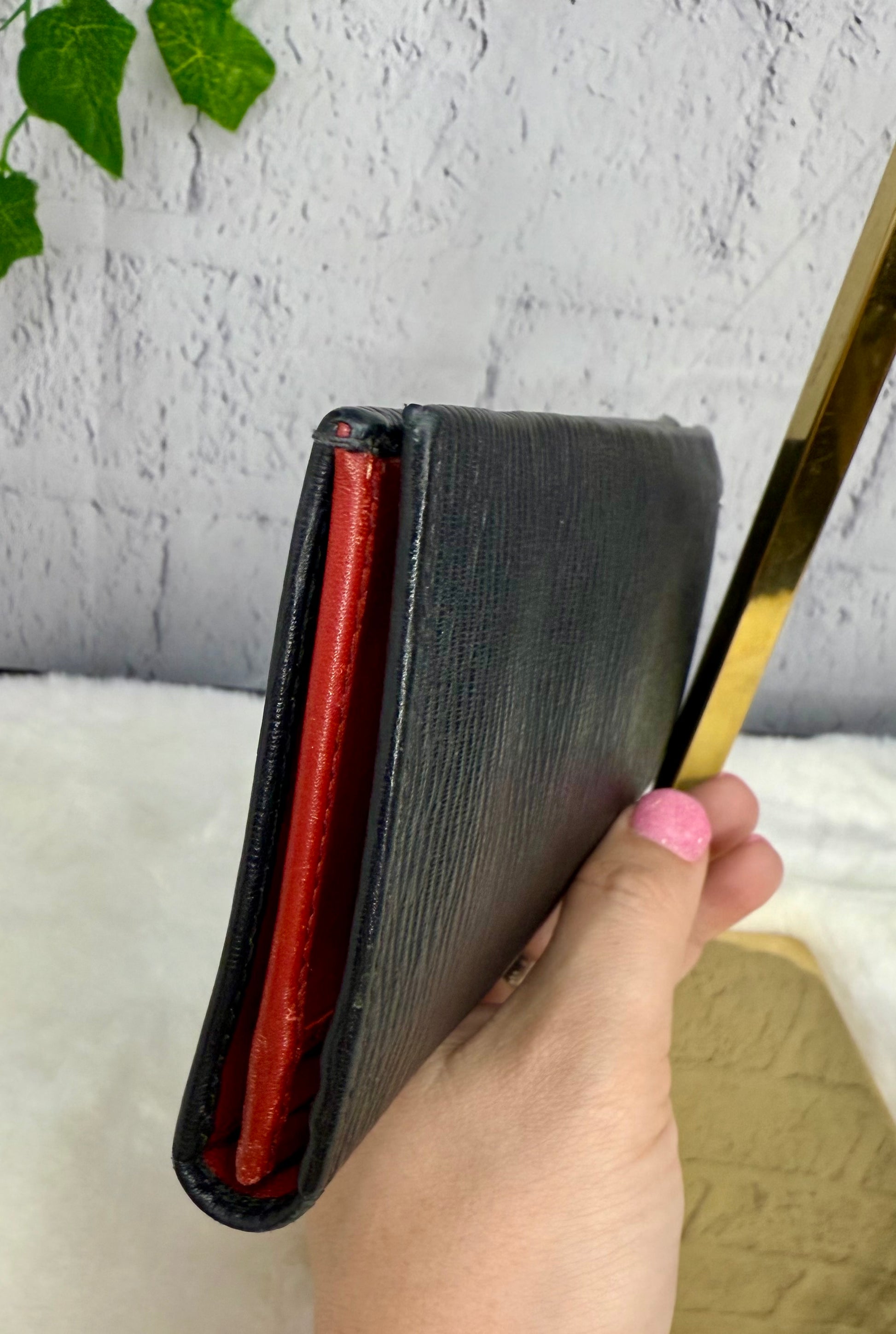 This authentic Salvatore Ferragamo Gancini Organizer Wallet is the perfect blend of fashion and practicality. The textured leather exterior adds a touch of sophistication while the bold red interior makes a statement. Keep your essentials organized in style!