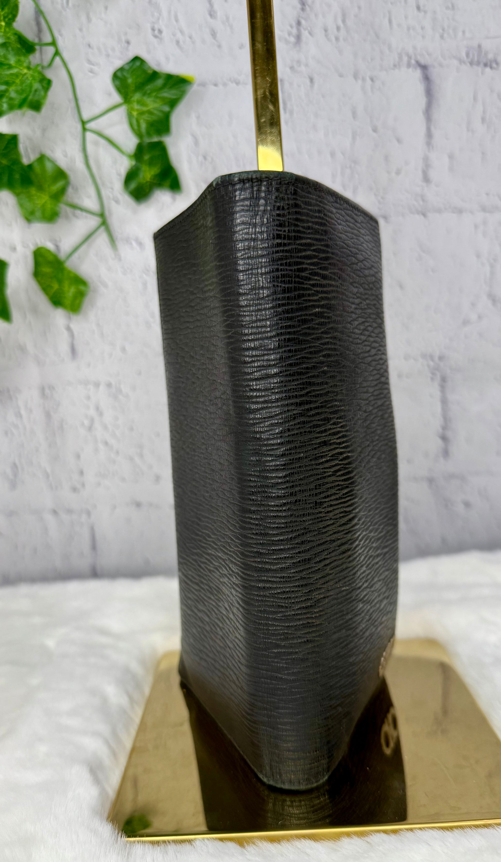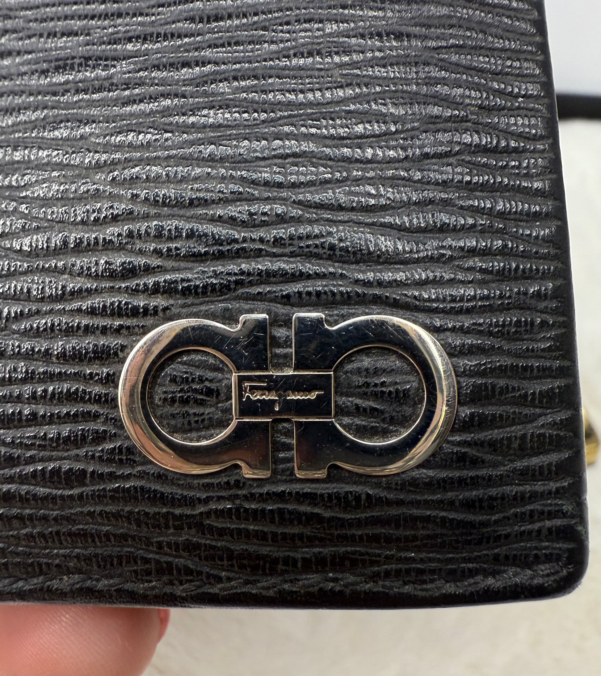 Exterior: The leather has a unique texture and only minimal wear, with a slight scratch on the back (easily seen in photos). No cracks, just the tiniest bit of misshaping from being preloved. It features the classic Ferragamo logo in silver hardware on the bottom corner.