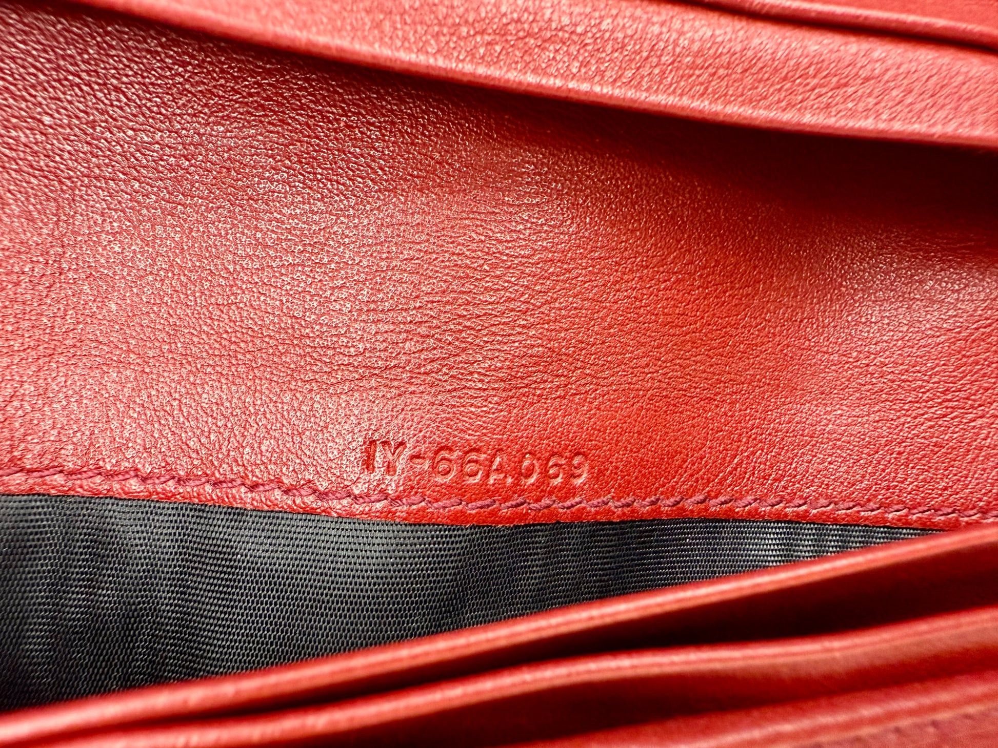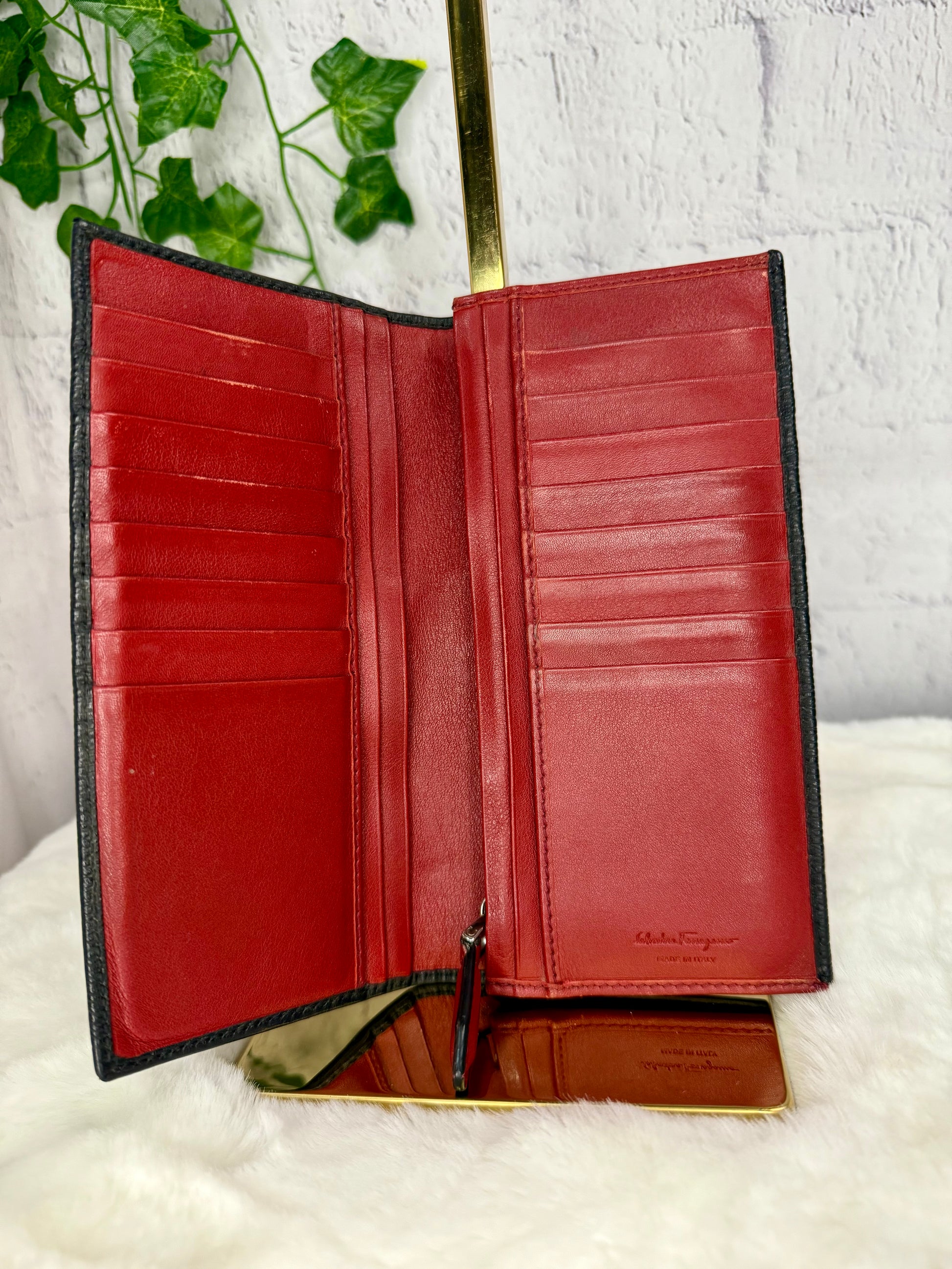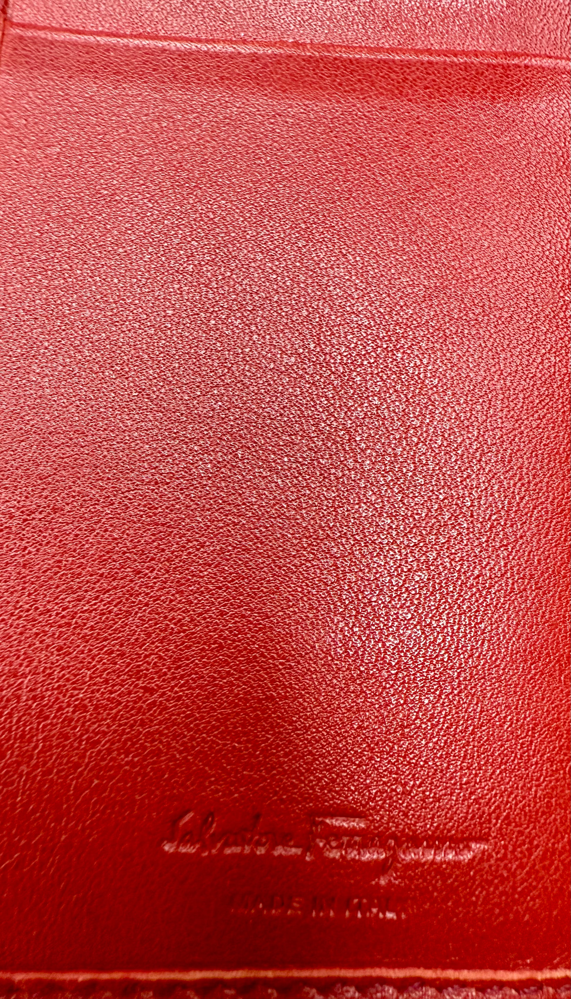 Interior: This wallet features a beautifully lined red leather interior, complete with 16 card slots, 7 interior pockets, and a zipped coin pocket for all your essentials. There is normal wear on the card slots and overall inside (peep the photos - it’s not that bad). The vinyl-like lining in the pockets is still in great condition and will ensure your wallet stays in top shape. The zip coin compartment had a little extra love and has minor coin residue and a small tear (but that can easily be fixed and it doesn’t go all the way through to the next pocket). The leather is stamped with the signature Salvatore Ferragamo imprint and serial number.